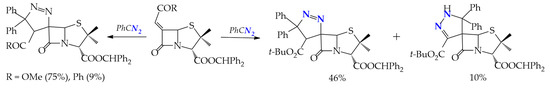 At a 1,3-dipolar addition of diphenyldiazomethane to 6-alkylidenepenicillanates, examples of regioselective and regiospecific syntheses with the formation of 1,2- and 2,3-spiropyrazoline systems are observed. Regio- and stereospecificity is observed in the interaction of diphenyldiazomethane with penicylates having Ph and COMe alkylidene substituents R to form 1,2-spiropyrazolines: (4′S,6S)-3-benzhydryl 4′-methoxycarbonyl- and (4′S,6S)-3-benzhydryl 4′-benzoyl-5′,5′-diphenyl-4′,5′-dihydrospiro[penicillanate-6,3′-(3H-pyrazole)]-3-carboxylates up to 75%. The change of the alkylidene substituent to CO2t-Bu leads to a stereoselective, but regioisomeric, mixture of 1,2- and 2,3-spiropyrazolines: (4′S,6S)-3-benzhydryl 4′-tert-butoxycarbonyl-5′,5′-diphenyl-4′,5′-dihydrospiro[penicillanate-6,3′-(3H-pyrazole)]-3-carboxylate and (6R)-3-benzhydryl 3′-acetyl-1′,5′-dihydrospiro[penicillanate-6,4′-(4H-pyrazole)]-3-carboxylate in a ratio of 46 and 10% (Scheme 4) [24].