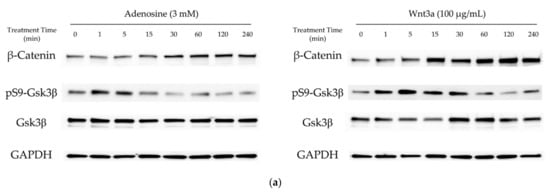 In our previous report, adenosine activated the Wnt/β-catenin signaling pathway through the modulation of Gsk3β activity [16]. To elucidate the molecular mechanism of the hair growth promoting activity of adenosine, the effects of adenosine on the Wnt/β-catenin signaling pathway were investigated in cultured hDPCs. Cells were treated with adenosine and recombinant Wnt3a, a positive control, and the protein levels of β-catenin, Gsk3β, and phospho-Gsk3β were analyzed at different time points (0 to 240 min) to compare the time course of signal activation. As shown in Figure 1a, adenosine was found to activate the Wnt/β-catenin signaling pathway in cultured hDPCs. The β-catenin expression was significantly increased at 30 min after adenosine treatment. The inhibitory phosphorylation level of Gsk3β-Ser9 site was elevated as soon as 1 min after treatment and lasted for 15 min (Figure 1b), and gradually diminished to basal level at 30 min treatment.