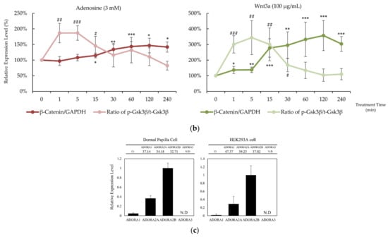 Adenosine activated Wnt/β-catenin signaling pathway in human dermal papilla cells. Cells were treated with adenosine for different times (0, 1, 5, 15, 30, 60, 120, and 240 min). (a) Whole cell lysates were analyzed by immunoblotting to determine the levels of β-catenin, pS9-Gsk3β, and Gsk3β. As an internal control, GAPDH was used. (b) The expression level of β-catenin, normalized with GAPDH, and the ratio of phosphorylated Gsk3β (Ser9) to total Gsk3β protein were evaluated. Wnt3a (100 ng/mL) was used as a positive control. (c) The mRNA expression profiles of ADORA1, ADORA2A, ADORA2B, and ADORA3 were examined in cultured human dermal papilla cells and HEK293A reporter cells. The data represent the means of six independent samples. Significantly different compared with 0 min treatment samples (β-Catenin * p < 0.05, ** p < 0.01, *** p < 0.001; ratio of pS9-Gsk3β/total Gsk3β (p-Gsk3β/t-Gsk3 β) # p < 0.05, ## p < 0.01, ### p < 0.001).