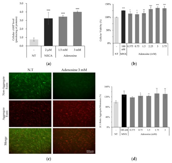 Adenosine enhanced cellular viability and mitochondrial energy metabolism in human dermal papilla cells. (a) Cellular cAMP level was increased by adenosine treatment for 2 min in hDPCs. (b) Cell viability measured by NADH/NADPH generation rates was enhanced by adenosine treatment for 4 h. (c) Mitochondrial membrane potential (△Ψ) was measured after adenosine treatment for 4 h. (d) JC-1 monomer form was seen as green and aggregate form as red by fluorescent microscopy. Minoxidil was used as a positive control. The data represent the means of six independent samples. MNX, minoxidil; N.T, non-treated control; Significantly different compared with N.T (* p < 0.05, ** p < 0.01, *** p < 0.001).