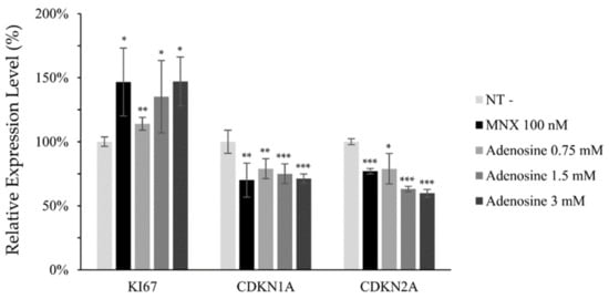 Adenosine modulated the mRNA expression of cell proliferation and cell cycle related genes in human dermal papilla cells. The mRNA expression level of cell proliferation marker (Ki67) and cell cycle arresters (CDKN1A and CDKN2A) was evaluated in hDPCs by RT-PCR after adenosine treatment for 24 h. Minoxidil was used as a positive control. The data represent the means of five independent samples. MNX, minoxidil; N.T, non-treated control; Significantly different compared with N.T (* p < 0.05, ** p < 0.01, *** p < 0.001).