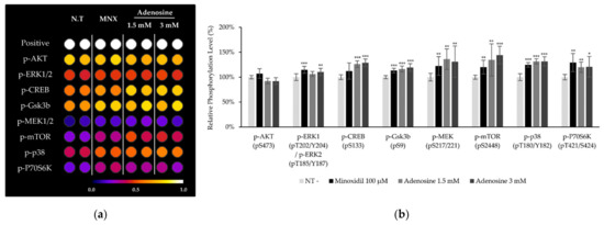 Adenosine enhanced protein phosphorylation and activated MAP kinases in human dermal papilla cells. (a) The phosphorylation of proteins including MAP kinases after 10 min treatment of adenosine was investigated. Seventeen proteins were analyzed and eight proteins are displayed. (b) Data were quantitated. Minoxidil was used as a positive control. The data represent the means of three independent samples. MNX, minoxidil; N.T, non-treated control; Positive, biotin-conjugated IgG; Significantly different compared with N.T (* p < 0.05, ** p < 0.01, *** p < 0.001).