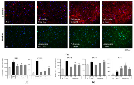 Adenosine activated Wnt target genes and growth factors in cultured human dermal papilla cells. (a) The induction of total β-catenin (red) and versican (green) expression level by 4 h treatment of adenosine was visualized by immunocytochemistry. Nuclei were stained by DAPI (Blue). The target genes of β-catenin were evaluated by RT-PCR after treatment with adenosine for 24 h. The mRNA expression level of (b) LEF1, AXIN2, and (c) growth factors (FGF2, FGF7, and IGF-1) and was increased by adenosine treatment. The data represent the means of five independent samples. NT, non-treated control; Significantly different compared with N.T (* p < 0.05, ** p < 0.01, *** p < 0.001).