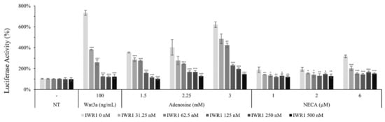 Adenosine stimulated canonical Wnt/β-catenin signaling pathway. The luciferase activity in WRHEK293A reporter cells was assessed after treatment with adenosine and NECA for 24 h in the presence/absence of IWR1, a Wnt inhibitor. Wnt3a was used as a positive control. The data represent the means of six independent samples. N.T, non-treated control; Significantly different compared with N.T (* p < 0.05, ** p < 0.01, *** p < 0.001).