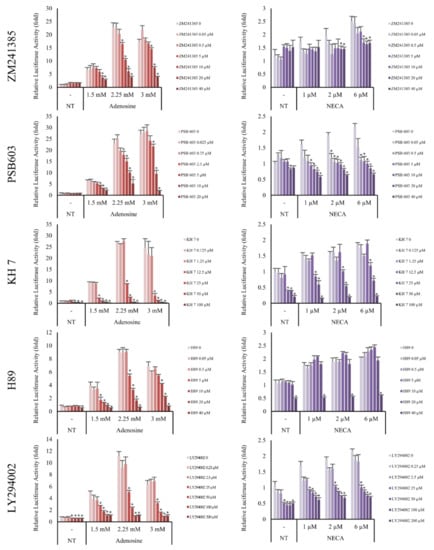 - Goulding, J.; May, L.T.; Hill, S.J. Characterisation of endogenous A2A and A2B receptor-mediated cyclic AMP responses in HEK 293 cells using the GloSensor™ biosensor: Evidence for an allosteric mechanism of action for the A2B-selective antagonist PSB 603. Biochem. Pharmacol. 2018, 147, 55–66. [Google Scholar] [CrossRef]