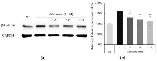 Activation of the Wnt/β-catenin pathway by adenosine was abolished in the presence of adenosine receptor antagonists and PKA inhibitor. The cells were treated with adenosine in the presence of various inhibitors (ZM241385, PSB603, and H89) for 4 h and harvested. (a) Whole cell lysates were analyzed by immunoblotting to determine the levels of β-catenin. GAPDH was used as an internal control. (b) The expression level of β-catenin was evaluated. The data represent the means of five independent samples. Significantly different compared with the adenosine treated control. (* p < 0.05, ** p < 0.01); Adenosine (3 mM); Z: ZM241385 (20 µM); P: PSB603 (10 µM); H: H89 (10 µM).