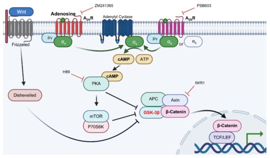 - Borhani, S.; Corciulo, C.; Larranaga-Vera, A.; Cronstein, B.N. Adenosine A2A receptor (A2AR) activation triggers Akt signaling and enhances nuclear localization of β-catenin in osteoblasts. FASEB J. 2019, 33, 7555–7562. [Google Scholar] [CrossRef]