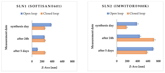 Comparison of the average particle size (Z-Ave) of the obtained SLNs synthesized using lipids Softisan® 601 and Imwitor® 900, and the surfactant Poloxamer 188, measured on the day of synthesis, and additionally 24 h and 5 days after the synthesis. The process of obtaining nanoparticles was carried out in an open-loop as well as a closed-loop system, under 300 bar pressure in three cycles.
