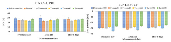 The PDI ratio for all surfactants was within the upper limit of 30%; moreover, even after several days of synthesis, it did not exceed this value. The zeta potential decreased slightly with time, which may indicate that the non-ionic surfactants used formed a stable layer on the surface of the solid lipid nanoparticles (Figure 3). Figure 3 also shows the ZP values (in Milli-Q® Plus water at pH = 5.50 and a conductivity of 50 μS/cm, and in aqueous surfactant solution), which were obtained immediately after synthesis, and 24 h and 5 days after the nanoparticle synthesis.