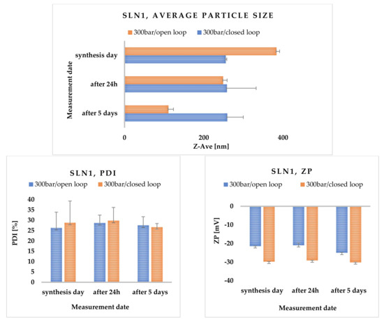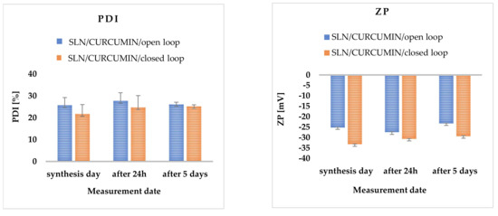 Comparison of the average particle size, polydispersity index (PDI) and zeta potential (ZP) of SLN-type lipid nanoparticles synthesized at 300 bar and incorporated with curcumin, measured on the day of synthesis, 24 h after synthesis and 5 days after synthesis, for a closed-loop system. The process was carried out in an open-loop and a closed-loop system in three cycles.
