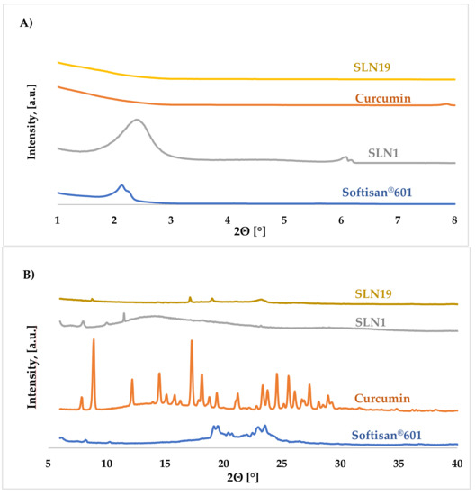 Figure 6A shows the low-angle diffractograms of Softisan® 601, unmodified (“empty”) SLN1, curcumin, and SLN19 (incorporated with curcumin), while Figure 6B shows the wide-angle diffractograms of the same materials.
