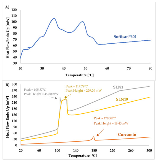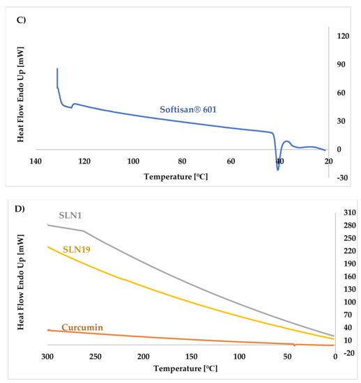 Figure 7A,B show a comparison of the thermograms of the SLN samples—both unmodified (“empty”) (SLN1, Figure 7B) and those modified with incorporated curcumin (SLN19, Figure 7B)—and the reference samples (i.e., Softisan® 601 (Figure 7A) and curcumin (Figure 7B)) during DSC heating; Figure 7C,D show the results recorded on cooling of the same samples.