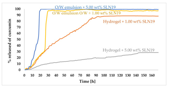 For the emulsion with 5.00 wt.% SLN19 in the first five hours of analysis, the release process was relatively slow. However, after the fifth hour, the release process increased rapidly, and as much as 99.80% of the active ingredient was released within 19 h from the beginning of the observation. A similar situation also occurred for the emulsion with 1.00 wt.% SLN19. However, a sudden increase in the percentage of released curcumin occurred at 22 h after the beginning of the analysis, and the maximum amount of active substance released was 97.20%. The release of curcumin from the hydrogel at both concentrations of SLN19 (1.00 wt.% and 5.00 wt.%) occurred gradually. Due to the slow release process of the active ingredient, a prolonged release was observed, which is beneficial for pharmaceutical and cosmetic formulations. The maximum amount of curcumin released from the hydrogel was 87.00% for 1.00 wt.% SLN19, and 28.50% for hydrogel with 5.00 wt.% SLN19.