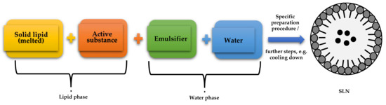 The best-known group of lipid nanoparticles is that of solid lipid nanoparticles, synthesized for the first time in 1991 [11]. They are colloidal lipid carriers that remain solid at room temperature and at human body temperature. These carriers are characterized by several functional advantages including high physical stability, composition based on lipids well absorbed by the human body, biocompatibility, and the lack of biotoxicity [12]. They usually have a spherical shape and particle diameter in the range of 50–1000 nm. Their small size and good application properties have prompted studies on the modification of the release of active ingredients and drugs [13]. Solid lipid nanoparticles are relatively easy to obtain and market due to the high availability of lipids [14]. However, their greatest advantages include non-toxicity, which is due to the biodegradable lipid structure [15]. A single solid lipid nanoparticle consists of an active ingredient along with a solid lipid (lipid phase) and an emulsifier with water (aqueous phase) (Scheme 1) [16].