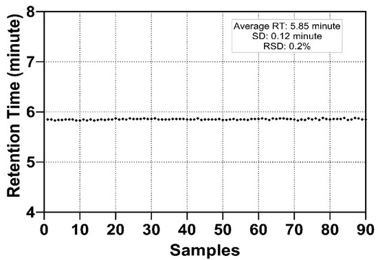 Retention time of a tryptic HPX O-glycopeptide on an Acclaim PepMap 100 C18 column. The consistent elution time at 5.85 ± 0.12 min demonstrates excellent reproducibility.