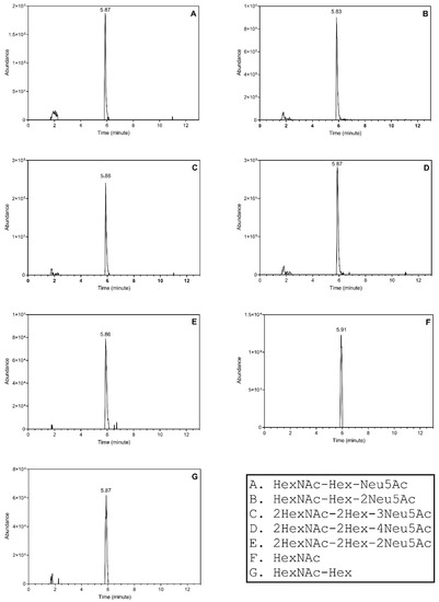 LC-MS/MS analysis was performed using an Ultimate 3000 RSLCnano chromatograph and Orbitrap Fusion Lumos Mass Spectrometer platform (Thermo) with a multi-nozzle emitter (NEWOMICS, Berkeley, CA, USA) used as the microflow sprayer. Glycopeptide separation was achieved in microflow mode using an Acclaim PepMap 100 capillary column 75 μm ID × 20 mm length, packed with C18 5 μm, 300 Å (Thermo). Glycopeptides were separated as follows: starting condition flow 5 µL, 2% ACN, 0.1% formic acid; 0–1 min flow 5 µL, 2% ACN, 0.1% formic acid; 1–2 min flow 1.5 µL, 2–5% ACN, 0.1% formic acid; 2–5 min flow 1.5 µL, 5–98% ACN, 0.1% formic acid; 7–9 min flow 1.5 µL, 98% ACN, 0.1% formic acid; followed by equilibration to starting conditions for an additional 4 min (Supplementary Figure S1).