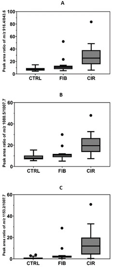 Quantification of S-HPX in control (CTRL, n = 15) and progressing stages of liver disease, liver fibrosis (FIB, n = 15), and cirrhosis (CIR, n = 15). S-HPX, the ratio of monosialylated glycopeptide of the same structure (disialoT/monosialoT) increases significantly (p < 0.01) from the control, to the fibrosis and cirrhosis groups. Ratio of (A) HexNAc-Hex-2Neu5Ac/HexNAc-Hex-Neu5Ac, (B) 2HexNAc-2Hex-3Neu5Ac/2HexNAc-2Hex-2Neu5Ac, (C) 2HexNAc-2Hex-4Neu5Ac/2HexNAc-2Hex-2Neu5Ac.