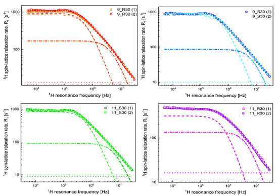 The 1H spin-lattice relaxation data obtained for the set of samples listed in Table 1 are presented in Figure 1. Two observations can be made at this stage—the first one is that the data for the two samples of each kind ((1) and (2)) are in a good agreement. Moreover, the other replicates were also consistent with each other. The second observation is that the relaxation rates for 9S30 and 11S30 are very close, while the relaxation rates for 9_R30 and 11_R30 differ from them and are considerably different between each other.