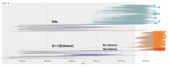 Phylogenetic tree of SARS-CoV-2 variants showing the position of the Delta and Omicron variants (https://nextstrain.org/ncov/gisaid/global?branchLabel=emerging_lineage&dmin=2022-01-12; accessed on 12 March 2022).