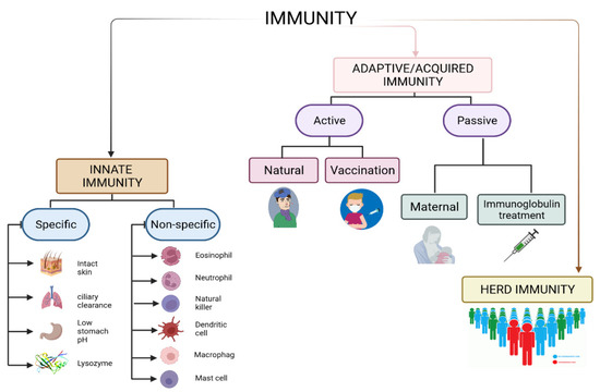 The types of immunity. Immunity refers to the ability of the body to prevent the invasion of foreign disease-causing microorganisms or substances. It is divided into innate and acquired immunity. The figure was prepared using Biorender (https://app.biorender.com; accessed on 14 March 2022).