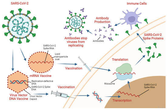 Schematic representation of how vaccination works. This image shows a simplified version of how the vaccine mechanism can block the SARS-CoV-2 virus from infecting a person’s body, starting with the manufacture of vaccines based on the SARS-CoV-2 virus. In this example, an mRNA vaccine contains the SARS-CoV-2 spike RNA. This RNA will be translated by the ribosome to make a spike protein, which can later be recognized by the immune system and produce antibodies that prevent the SARS-CoV-2 virus from replicating. There are also vaccines that use replication-defective viral vector DNA. This vaccine enters like a viral infection and then injects its DNA into the body. The body transcribes and translates it, but the spike protein is only produced later. The figure was prepared using Biorender (https://app.biorender.com; accessed on 01 February 2022).