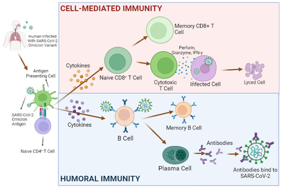 Omicron infection as a natural way of vaccination works by triggering infection-induced immunity, incorporating both humoral and cell-mediated immunity. Adapted from Schijns et al. [102]. The figure is created using Biorender (https://app.biorender.com; accessed on 1 March 2022).