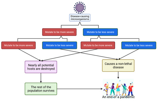 We presume that this notion leads people to believe that the disease will become less contagious over time as the causal agent continues to mutate. The majority of mutations are detrimental to the organisms that carry them. Because many mutations result in organisms leaving fewer descendants over time, natural selection acts to eliminate these mutations from the population [6]. In other words, having an excessive number of mutations becomes a burden, eventually resulting in their eventual extinction. The “avirulence theory” and “Theobald Smith’s Law of Declining Virulence” are two terms used to describe this [108]. It appears that disease-causing hosts benefit from mutating to be less virulent.