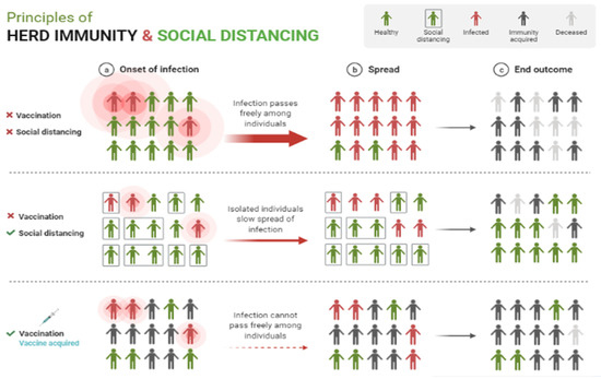 How a pandemic end by incorporating vaccination and social distancing to achieve herd immunity. Adapted from “Principles of Herd Immunity and Social Distancing” (source: https://app.biorender.com; accessed on 3 February 2022).