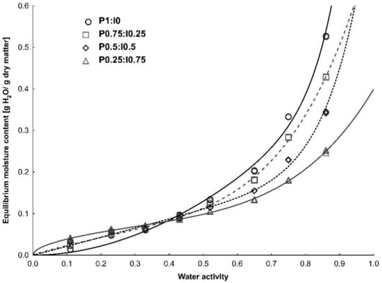 The water adsorption isotherms of freeze-dried pumpkin powders with various inulin additions, adjusted by Peleg model, are presented in Figure 1. They express the amount of adsorbed moisture (Xw) as a function of water activity in each of the studied powders. It was found that the curve of pure pumpkin powder was J-shaped (type III), which is characteristic of many fruits rich in low molecular weight sugars [24]. The addition of the inulin resulted in the curve shape changing into a sigmoidal type II (according to ) classification. A similar trend was reported for pumpkin powder with maltodextrin additions [9] and avocado powders produced with inulin as a carrier [25]. The sigmoidal curve shape is the most common isotherm type for food products and it is characteristic for materials containing high molecular weight substances such as polysaccharides or proteins [24]