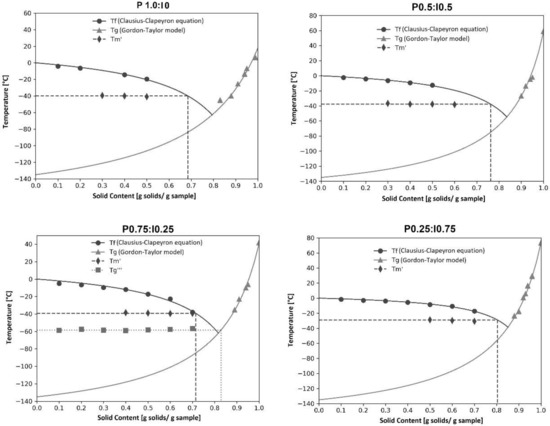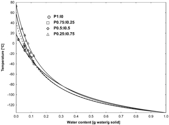 Based on the values of parameter E calculated for the Chen model and the Clausius-Clapeyron equation, the molecular weight of the tested blends was determined and ranged from 68 to 206 g/mol and from 83 to 229 g/mol, respectively. In both cases, as predicted, an increase in the MW value was noted with an increasing proportion of inulin in the sample (with one exception for calculation by the Chen model). The molecular weight values determined for pumpkin-inulin powders were relatively low compared to those calculated for other food products, which may result from insufficient fitting of the model to experimental data. The values of the coefficient of determination calculated for the Chen model were slightly higher than those determined for the Clausius-Clapeyron equation. However, in the case of the Chen model, some of the estimated parameters were not statistically significant. Therefore, state diagrams plotted with curves determined using the Clausius-Clapeyron equation. Critical parameter values estimated from state diagrams of pumpkin–inulin systems were shown in Table 4. The Tm′ parameter is defined as the end point of freezing and it is known that below Tm′ the sample cools without forming ice [40]. In our research the Tm′ point was plotted from the cooling curve by the method proposed by Rahman et al. [41].