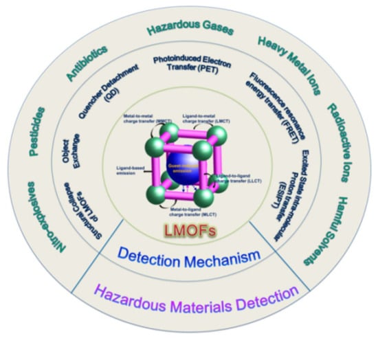 In recent years, LMOFs, as one of the more widely used branches of MOFs, have flourished in the fields of optical security displays, biomedical imaging and sensing, and illumination decoration due to their optical tunability and fluorescence diversity, particularly in the field of toxic and hazardous substance detection [13]. Here we highlight the latest advances in sensing applications of MOFs-based fluorescent sensors for hazardous materials, including harmful gases, heavy metal ions, radioactive ions, and a range of harmful organic pollutants, with an emphasis on the influence of composition or structure on the sensing capabilities of LMOFs, as shown in Figure 1. Various luminescence sensing mechanisms and structure-performance relationships are also briefly described. Additionally, the outlooks and several crucial issues of this area are also noted with the expectation of stimulating more attention on investigating the potential of LMOFs for sensing applications.