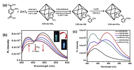 (a) The post-synthesis process of UIO-66-ONa. (b) Fluorescence spectra of UIO-66-ONa after the gradual bubbling of CO2. (c) Fluorescence spectra of UIO-66-OH and UIO-66-ONa before and after bubbling of CO2. Adapted from [28].