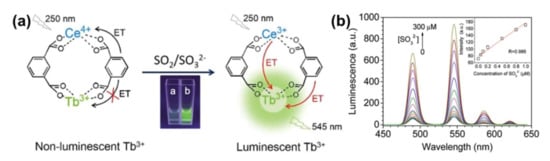 (a) Diagram of the Ce4+/Tb3+ based Ln-MOF for sensing SO2 and sulfite via the turn-on of luminescence induced by energy transfer (ET) triggered by redox-reaction. (b) The luminescence of Ln-MOF increases with the concentration (0, 0.05, 0.1, 0.2, 0.5, 0.8, 1, 5, 20, 50, 100, 150, 200, and 300 mM) of SO32−; the inset shows the linear relationship of the luminescence intensity of Ce-PA-Tb at 545 nm with the concentration of SO32−. Adapted from [53].