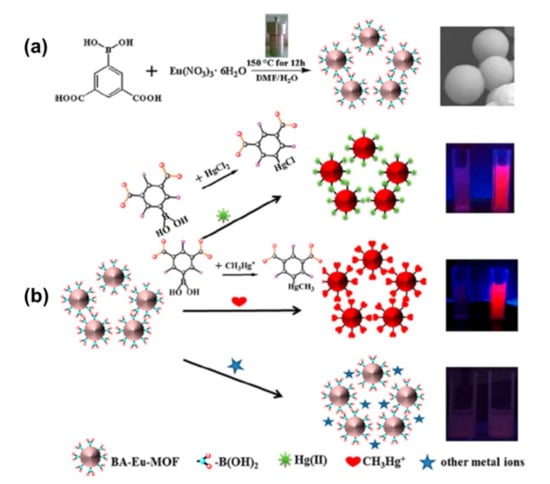 (a) Synthesis process of BA-Eu-MOF. (b) Schematic diagram of the sensing process of BA-Eu-MOF toward Hg2+ and CH3Hg+ ions based on transmetalation. Adapted from [82].