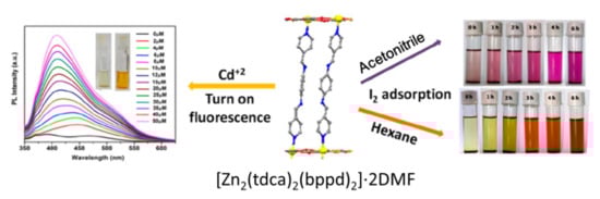 Structure of [Zn2(tdca)2(bppd)2]·2DMF, UV-vis spectra of [Zn2(tdca)2(bppd)2]·2DMF in acetonitrile suspension upon addition of Cd2+ at room temperature (λex = 330 nm), and photographs of the iodine release process in acetonitrile and hexane. Adapted from [86].