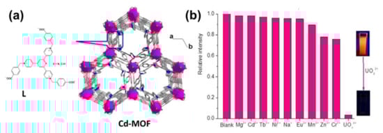Uranium Ion (UO22+): UO22+ has been extensively used in the development of nuclear technology, and there have been some unpredictable leaks over the last few decades. Very trace amounts of UO22+ in a human being can cause cancer and acute kidney and liver damage. Therefore, it is important to explore a new approach with high selectivity, high detection sensitivity, and operational simplicity to detect uranium. Liu et al. reported on a Tb-MOF with large channels to accommodate UO22+. Using the Tb-MOF, a luminescent detection of UO22+ can be realized in water and the LOD is 0.9 μg L−1 [89]. Compared with the above study, the LOD limit in water demonstrates a better practical application. Subsequently, they synthesized another Ln-MOF based sensor for detecting UO22+, namely [Eu2(MTBC)(OH)2(DMF)3(H2O)4]·2DMF·7H2O (MTBC = 4′,4′,4′,4′-methanetetrayltetrakis-[1,1′-biphenyl]-4-carboxylic acid) [90]. The detection limit towards UO22+ ions is 309.2 μg/L. Recently, many La-based LMOFs (CH3)2NH2[Ln2(BTC)(AC)3(FM)], (Ln = Pr, Ce, Nd, Eu, Sm, Gd, Tb, Ho, Er, and Yb, H3BTC = 1,3,5-benzenetricarboxylic acid) were obtained by adding H3BTC and Ln(NO3)3·6H2O with mixed formic acid (FM) into glacial acetic acid (AC) [91]. The authors indicated that (CH3)2NH2[Eu2(BTC)(AC)3(FM)] had rapid detection capabilities for UO22+ in an aqueous solution with a lower detection limit of 4.12 μM. At the same time, the quenching rate for UO22+ can reach 98.01%. In addition to La-based LMOFs, a carboxyl-functionalized 3D Zn-based LMOF [Zn(HL)(bipy)0.5(H2O)]·2H2O ([H3L = 9-(4-carboxy-phenyl)-9H-carbazoly-3,6-dicarboxylic acid, bipy = 4,4′-bipyridine]) was fabricated by Hou et al. with sensing ability for UO22+ ions in an aqueous solution by fluorescence quenching [92]. Chen and Wang obtained a series of 2D isomorphous MOFs [M(HBTC)(BMIOPE)·DMF·H2O]n (M = Zn, Zn0.7Co0.3, Zn0.5Co0.5, Zn0.3Co0.7, Co, BMIOPE = 4,4′-bis(2-methylimidazol-1-yl)diphenyl ether, H3BTC = 1,3,5-benzenetricarboxylic acid) to discuss the optical detection of UO22+ in an aqueous solution [93]. Seven isostructural MOFs indicating novel 2D→2D supramolecular entanglement featuring catenane-like interlocking of tricyclic cages by the assembly of two tripyridinium-tricarboxylate ligands and different metal ions were reported by Guo et al., as shown in Figure 12a [94]. The tripyridinium-afforded and metal-modulated photoresponsive properties of Cd-MOF allow it to be used as a potential fluorescence sensor for sensitive and selective detection of UO22+ in water, as shown in Figure 12b. The photoresponse in both light absorption (color) and emission has the appeal for applications in dual-output optical devices. Mechanistic experiments showed that network entanglement dictates close donor-acceptor contacts, which make fluorescence originating from ILCT. These contacts also allow photo-induced electron transfer, which is the basis for the photochromic and corresponding fluorescence reactions. Metal dependence in fluorescence and photochromism can be bound up with energy transfer through metal-centered d-d conversions. Importantly, LMOF-based sensors are highly capable of detecting UO22+ ion in natural water systems such as lake and sea water, which provides an excellent development strategy for UO22+ detection.