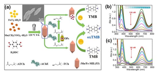 - Luo, L.; Ou, Y.; Yang, Y.; Liu, G.; Liang, Q.; Ai, X.; Yang, S.; Nian, Y.; Su, L.; Wang, J. Rational construction of a robust metal-organic framework nanozyme with dual-metal active sites for colorimetric detection of organophosphorus pesticides. J. Hazard. Mater. 2022, 423, 127253. [Google Scholar] [CrossRef] [PubMed]