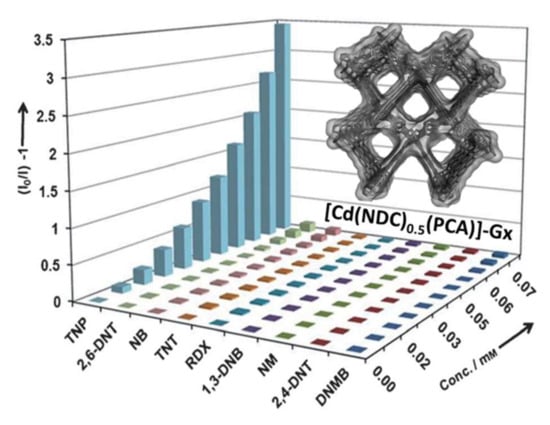- Nagarkar, S.S.; Joarder, B.; Chaudhari, A.K.; Mukherjee, S.; Ghosh, S.K. Highly selective detection of nitro explosives by a luminescent metal–organic framework. Angew. Chem. Int. Ed. 2013, 52, 2881–2885. [Google Scholar] [CrossRef] [PubMed]