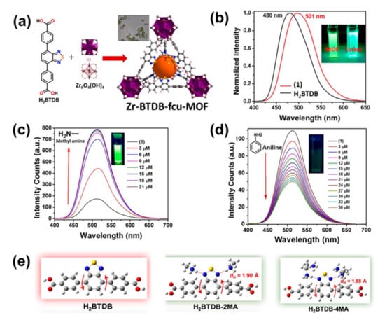 - Mallick, A.; El-Zohry, A.M.; Shekhah, O.; Yin, J.; Jia, J.; Aggarwal, H.; Emwas, A.H.; Mohammed, O.F.; Eddaoudi, M. Unprecedented ultralow detection limit of amines using a thiadiazole-functionalized Zr (IV)-based metal–organic framework. J. Am. Chem. Soc. 2019, 141, 7245–7249. [Google Scholar] [CrossRef]