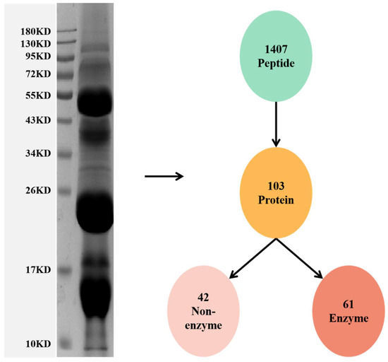 First, sodium dodecyl sulfate-polyacrylamide gel electrophoresis (SDS-PAGE) was used to observe the molecular weight distribution of the snake venom protein (Figure 1). The molecular weight of the venom proteins ranged from 14.4 to 116 kDa. The predominant proteins were at 60 kDa, 20–26 kDa, and 14.4 kDa (Figure 1). Then, the protein bands were analyzed by label-free proteomics. The value of peptide parent ion mass tolerance is between −0.1 to 0.1 Da (Supplementary Figure S1). The length and the number of unique peptides were determined to estimate the quality of the proteomic data (Supplementary Figure S1). Based on the qualified data, 1407 peptides, matching 103 proteins, were identified in the snake venom (Figure 1). These identified proteins can be divided into two main groups, 42 enzymatic (32%) and 61 non-enzymatic proteins (68%) (Figure 2A). The predominant enzymatic proteins include phospholipase A2 acidic precursor (13.803%), snaclec agkicetin-C subunit α (12.559%), antithrombin A B-chain (12.478%), Lys-49 Phospholipase A2 precursor (10.743%), thrombin-like protein acutobin precursor (7.159%), and antithrombin AB-chain (2.478%). The following constituted the most abundant non-enzymatic proteins, snaclec anticoagulant protein subunit A (3.888%), snaclec clone (3.437%), agkisasin-b (3.316%), agglucetin-α subunit precursor (1.608%), and agkisacutacin B-chain (1.555%) (Figure 2B). In summary, the venom’s proteome comprises phospholipase A2, snaclec agkicetin, antithrombin, and metalloproteinase as the most abundant constituents based on the iBAQ value (Table 1).