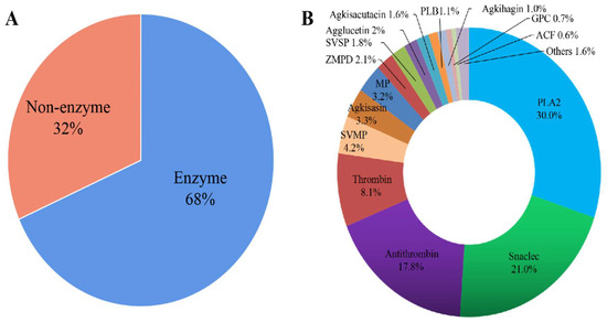 Overall protein composition of Deinagkistrodon acutus venom. (A) The classification of snake venom protein. (B) Overall protein composition of Deinagkistrodon acutus’s venom. The relative content of protein families in the venom of Deinagkistrodon acutus.