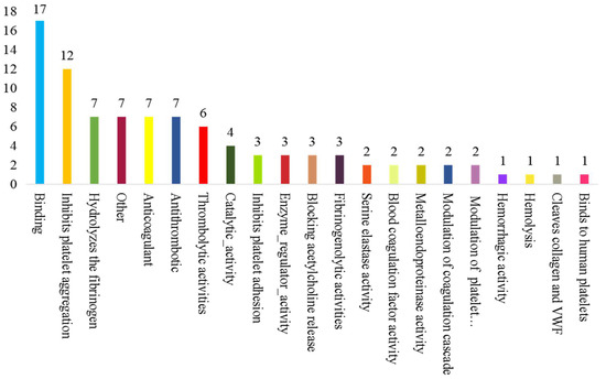 UniProt, David 6.7, and Cluster of Orthologous Groups of proteins were performed to explain the potential biological properties of Deinagkistrodon acutus venom. The main functional proteins included binding (15%), inhibition of platelet aggregation (14%), fibrinogen hydrolysate (9%), anticoagulant (8%), binding catalytic activity (7%), catalytic activity (5%), inhibition of platelet adhesion (4%) and antithrombotic and thrombolytic activity (4%) (Figure 3). The above results suggested that snake venom may have anticoagulant activity, antithrombotic activity, and contribute to coagulation disorders.