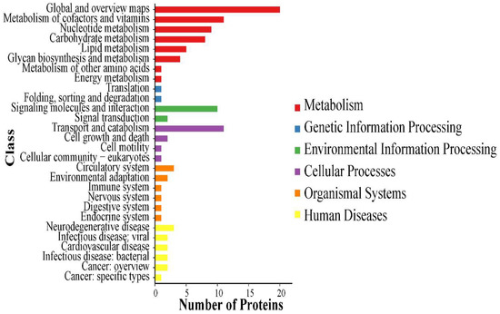 In 11 March 2021, UniProt (https://www.uniprot.org/, accessed on 11 March 2021), database David 6.7 (http://david.abcc.ncifcrf.gov/, accessed on 11 March 2021) and Cluster of Orthologous Groups of proteins (https: //www.ncbi.nlm.nih.gov/COG/, accessed on 11 March 2021) were performed to explain potential biological properties of identified proteins. Pathway mapping of identified proteins was performed using the KEGG database (http://www.genome.jp/kegg/, accessed on 11 March 2021) [23]. Protein-protein interaction was analyzed using the STRING database [24].