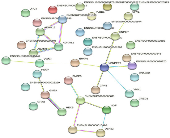 Using the KEGG database, the 67 pathways associated with the highest number of proteins identified from Deinagkistrodon acutus venom are shown in Figure 4, and all pathways found are recorded in Table S1. Global and overview maps are the most enriched pathway identified for venom. Other enriched pathways include Metabolism of cofactors, vitamins Nucleotide metabolism, Transport and catabolism and Signaling molecules and interaction. Discussions relating to the interpretation of enriched KEGG pathways can be found in Supplemental File S1. In Figure 5, the protein-protein interactions of the Deinagkistrodon acutus venom (PPI) network is shown.