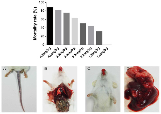 The primary toxicity of Deinagkistrodon acutus venom is hematotoxicity and neurotoxicity, and it obviously acts on the lung. Mice injected i.v. with Deinagkistrodon acutus venom presented with evident manifestations of limb paralysis and respiratory difficulties. After injection of different doses of snake venom, mice have the symptoms of ulceration of tail injury, even tail necrosis (Figure 6A). Mice had sluggish symptoms, severe convulsions, and subsequently, death (Figure 6B), and symptoms of mouth nose bleeding (Figure 6C). Mouse pleural blood, with the lungs spread through dark red pathological injury (Figure 6B,D) was found by anatomical studies on the mice.