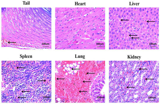 The results of the HE staining section showed that a large number of red blood cell fragments and inflammatory cell infiltration appeared in the tail (Figure 7 Tail). A small amount of inflammatory cell infiltration and red blood cell fragments could be seen in the heart and liver (Figure 7 Heart, Liver). In addition, apparent tissue damage, inflammatory cell infiltration, and red blood cell fragments were observed in spleen and kidney tissues (Figure 6 Spleen, Kidney). It is worth noting that the lungs of mice were the most damaged. The lung tissue’s structural integrity was destroyed, the internal structure was unclear, and some endothelial cells were lysed and necrotic. Large thrombi were observed in pulmonary vessels. Similar to in the lung and kidney, there was inflammatory cell infiltration and red blood cell fragments in the lung tissue space (Figure 7 Lung).