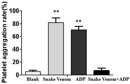 The PRP and PRP were harvested from SD rats. An aliquot of 8 mL blood was gently mixed with 880 µL citrate sodium anticoagulant (3.8%, v/v). Afterward, platelet-rich plasma (PRP) was obtained after centrifugation at 1000 rpm/min for 10 min. The residue was further centrifuged at 3000× g rpm/min for 10 min to obtain platelet-poor plasma (PPP). Deinagkistrodon acutus venom solution (0.5 mg/ mL) was preincubated with PRP at 37 °C for 5 min and then stimulated with different aggregating agents at the following final concentrations (ADP 15 μM or normal saline). Platelet aggregation was assayed by a platelet aggregation instrument (AggRAM, Helena, MT, USA), and the maximum aggregation rate was recorded in 5 min.