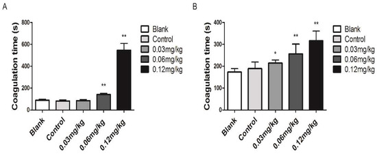 Anticoagulant activity of Deinagkistrodon acutus venom. (A) Blood coagulation time was determined using capillary methods. (B) Blood coagulation time was determined using the slide methods. All data are presented as mean ± SD, n = 10, * p < 0.05 and ** p < 0.01, compared with the control group.