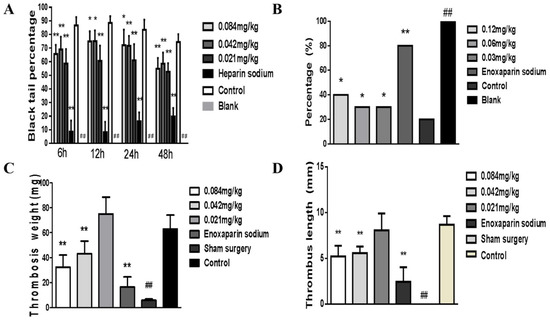 Effect of Deinagkistrodon acutus venom on thrombosis. (A) Effect of snake venom on carrageenan-induced tail thrombosis. (B) Effect of snake venom on collagen-adrenalin-induced acute pulmonary embolism. (C,D) Effect of snake venom on deep vein thrombosis induced by inferior vena cava ligation. The effect of snake venom on thrombosis was evaluated by measuring the length of blacktail induced by carrageenan, the survival rate of collagen-adrenalin-induced acute pulmonary embolism, and the length and weight of thrombus in IVC control. All data are presented as mean ± SD, n = 10, * p < 0.05, ** p < 0.01, compared to the control group.Blank control group and sham surgery group compared to the control group, all data are presented as mean ± SD, n = 10, ## p < 0.01.