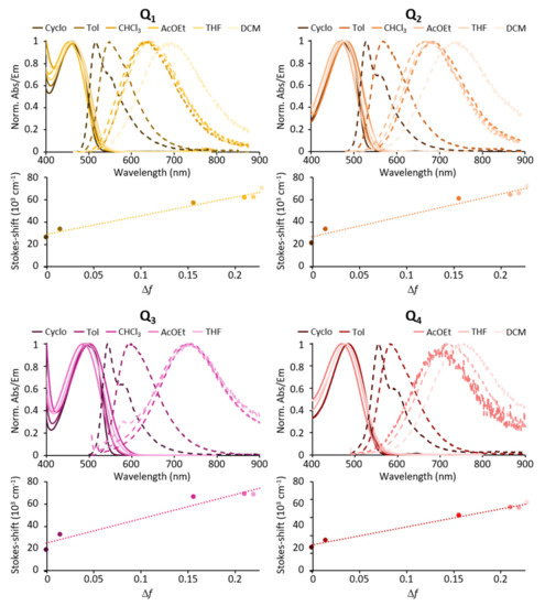 All compounds show intense fluorescence when dissolved in apolar solvents such as toluene (Table 1). Both increasing the strength of the donating end-groups and of the acceptor core induces a broadening of the absorption band, and a bathochromic shift of the emission band with fluorescence shifting from green for Q1 to yellow for Q2 and red for Q3 and Q4 (Figure 3). The polarity of the solvent is found to significantly affect the emission of all four dyes. Indeed, a marked red shift of the emission spectrum and an increase in the Stokes shift values are observed with increasing solvent polarity (Table 1, Figure 3). As a result, the emission is shifted from green in apolar cyclohexane to red (Q1) or NIR (Q2–Q4) in low-medium polarity solvents such as tetrahydrofurane (THF). In parallel, a dramatic decrease in the fluorescence quantum yield is observed (see Table 1) such that all dyes are non-fluorescent in polar solvents and dyes having the strongest donating end-groups (Q3) or core (Q4) show vanishing fluorescence even in medium-low polarity solvents.